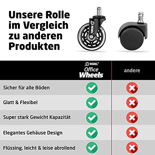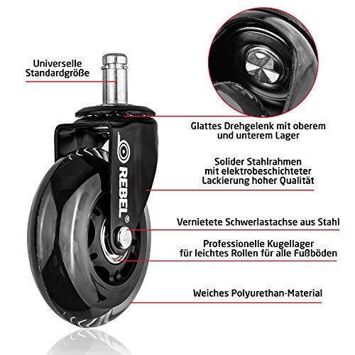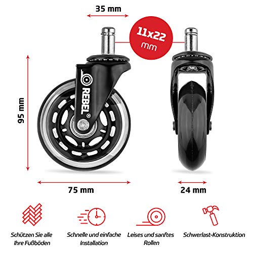 Rebel Set van 5 wieltjes voor harde vloeren, voor bureaustoel, wielen, bureaustoel en gamingstoel, zwenkwielen, 11 x 22 mm, geschikt voor de meeste draaistoelframes