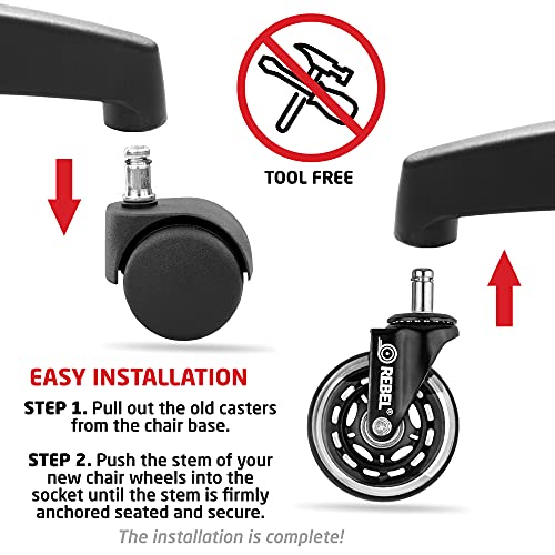Maat: 11 mm Regelmatige schachtdiameter Wil je niet meer de krassen en krassen zien die je bureaustoel op je favoriete vloer achterlaat? Heb je het voortdurende krasgeluid bij het verplaatsen van de werkstoel zagen? Alle fabrikanten van kantoor- en computerstoelen verrichten deze vandaag met goedkope zwarte kunststof wielen van lage kwaliteit. Na verloop van tijd krassen deze je vloeren meer en meer. Natuurlijk kun je het met plastic matten proberen – maar je kunt je vloeren niet beschermen tegen schade. Kleine stofdeeltjes vallen tussen de vloer en de mat – en laten je dure vloer nog steeds bekrassen. Probeer het Rebel Caster Wheels Pack in rolschoenstijl! Vervang gewoon je oude minderwaardige kunststof rollen door rebelwieltjes, ze zijn duurzaam en veilig voor alle vloeren, met name voor houten vloeren. Zachte, geluidsarme rollen – gemaakt van hoogwaardig, transparant polyurethaan – beschermen betrouwbaar alle soorten vloeren, inclusief houten en hardhouten vloeren, laminaat-, vinyl- en tegelvloeren. De in de constructie van wiel en frame ingebouwde precisiekogellagers zorgen voor een fluweelzachte en geruisloze stoelbeweging. Kenmerken van de stoelwielen: universele stang – 11 mm x 22 mm – past bij alle kantoorwerkstoelen die in Europa worden verkocht. Met 11 mm steel – zoals Herman Miller Steelcase, Aeron, Dxracer, Humanscale Freedom, Lazyboy Serta, Hon, Boss, en meer. Onze stoelwielen passen op 95% van alle bureaustoelen op de markt en vereisen geen gereedschap voor de installatie. Betrouwbare zwaartegoed: frame, voorbouw en wielas zijn allemaal gemaakt van roestvrij staal. De wielen bestaan uit duurzaam hard plastic met een schaal van hoogwaardig transparant polyurethaan. Eenvoudige installatie – trek gewoon de oude wielen zonder gereedschap van het stoelframe af en schuif de voorbouw van je nieuwe Rebel stoelwielen in de opname, de stuurpen stevig verankerd.